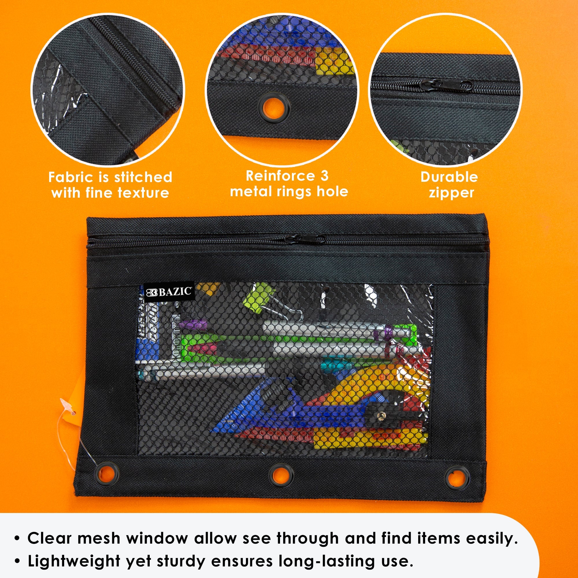 Pencil Pouch 3-Ring Black Color w/ Mesh Window