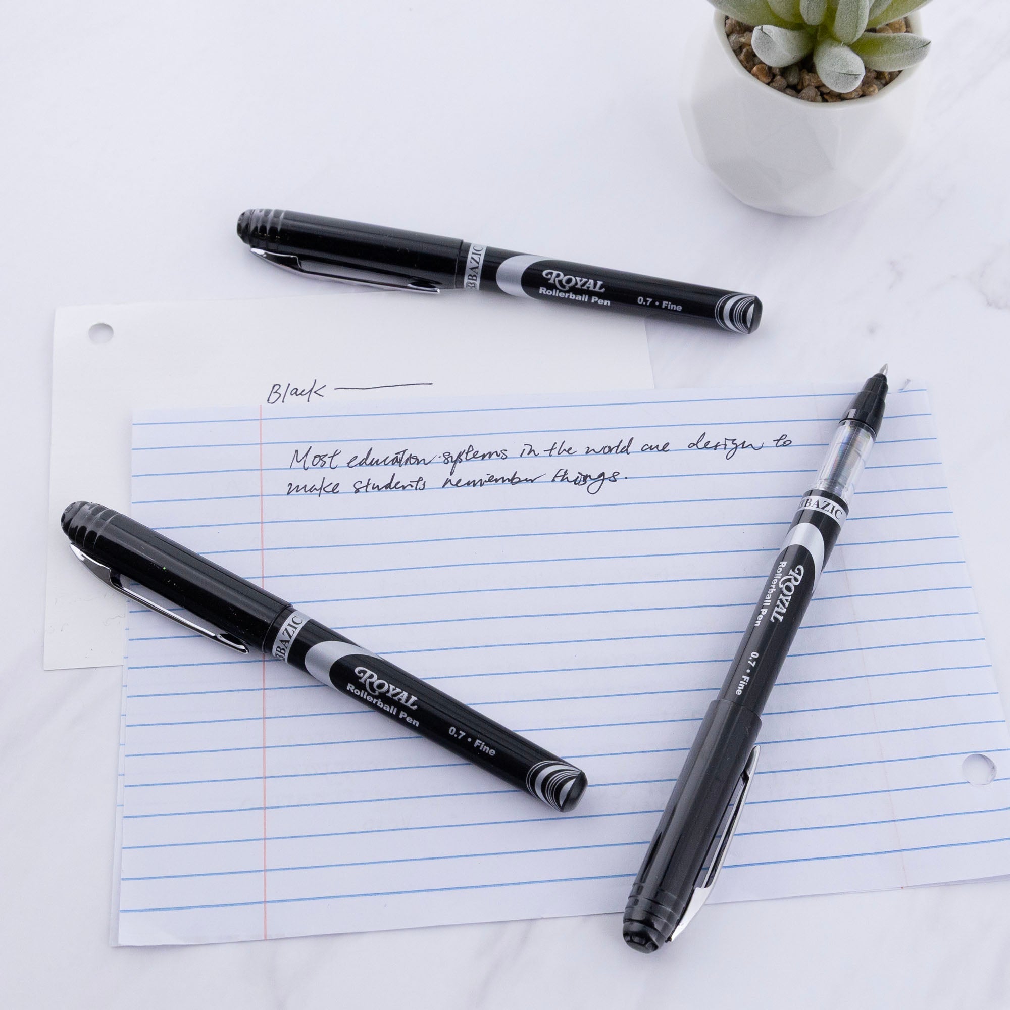 - ROYAL BLACK COLOR ROLLERBALL PEN. Each pack includes 3-Black Rollerball Pens. These fine point pens flow free and write more smoothly than traditional pens. A perfect choice for your everyday use.