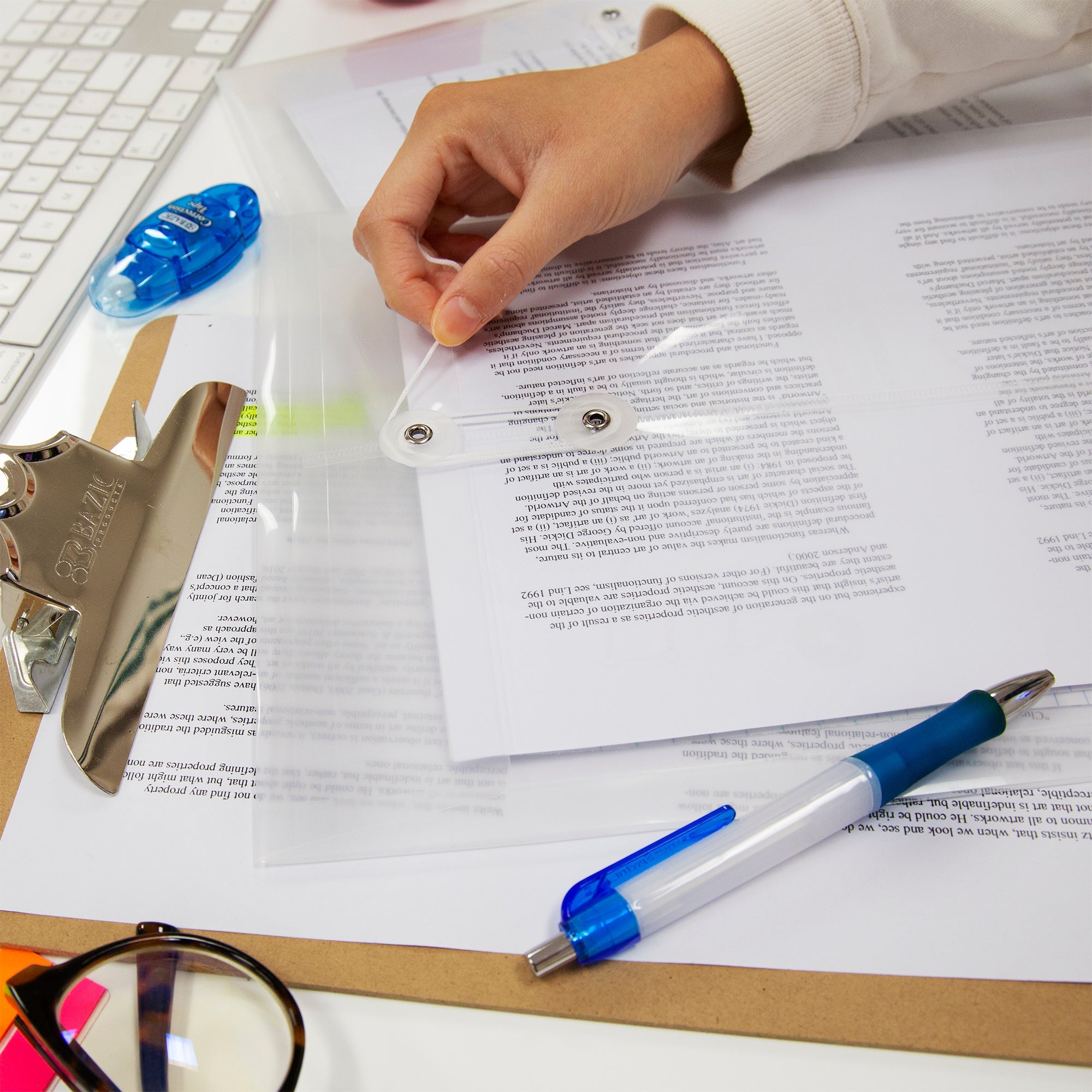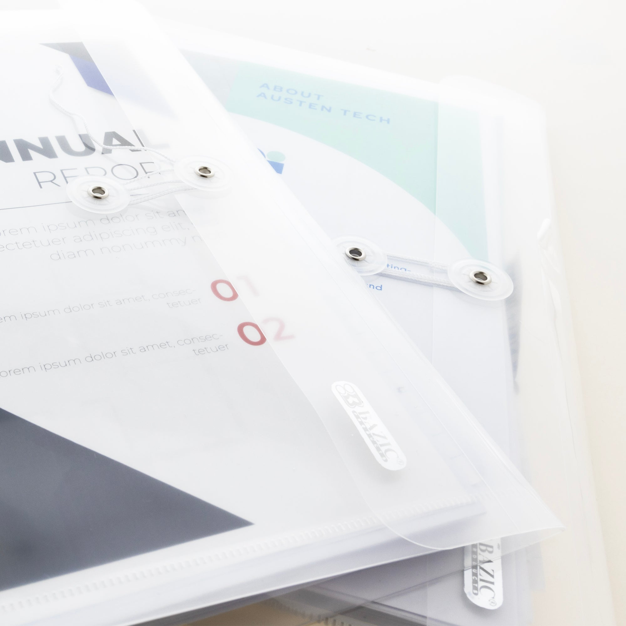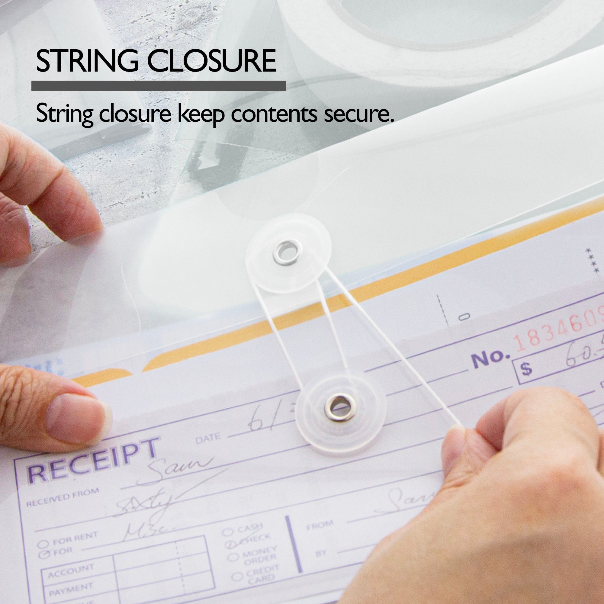 - TRANSPARENT. Flap envelope with string closure. Single pocket. Transparent color folder bag allows easy inspection of the contents inside the file folder.