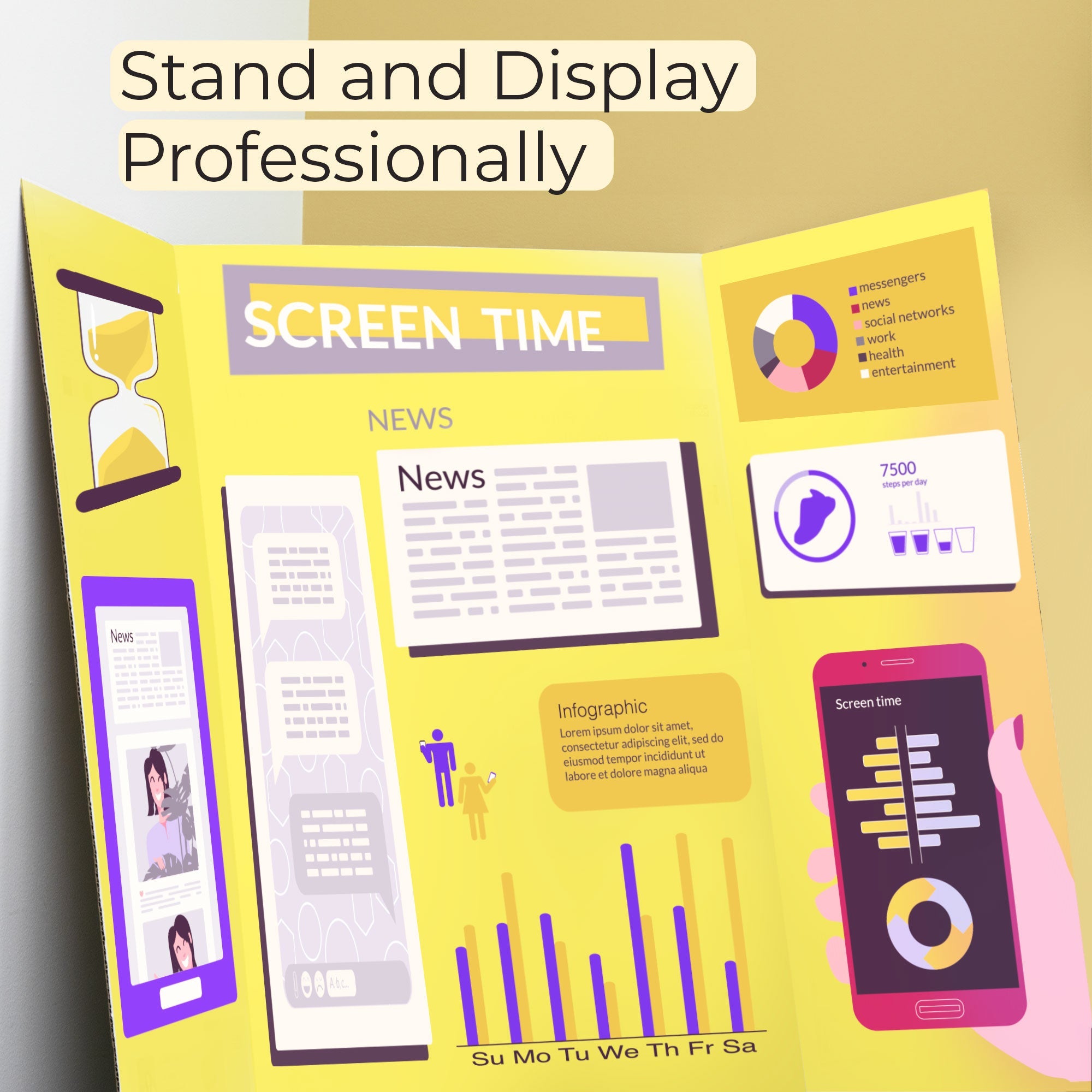 - SELF-STANDING. Tri-fold corrugated display poster boards. Pre-scored panels fold out for instant set-up. Foldable for easy storage and transport. Rigid yet lightweight and portable.